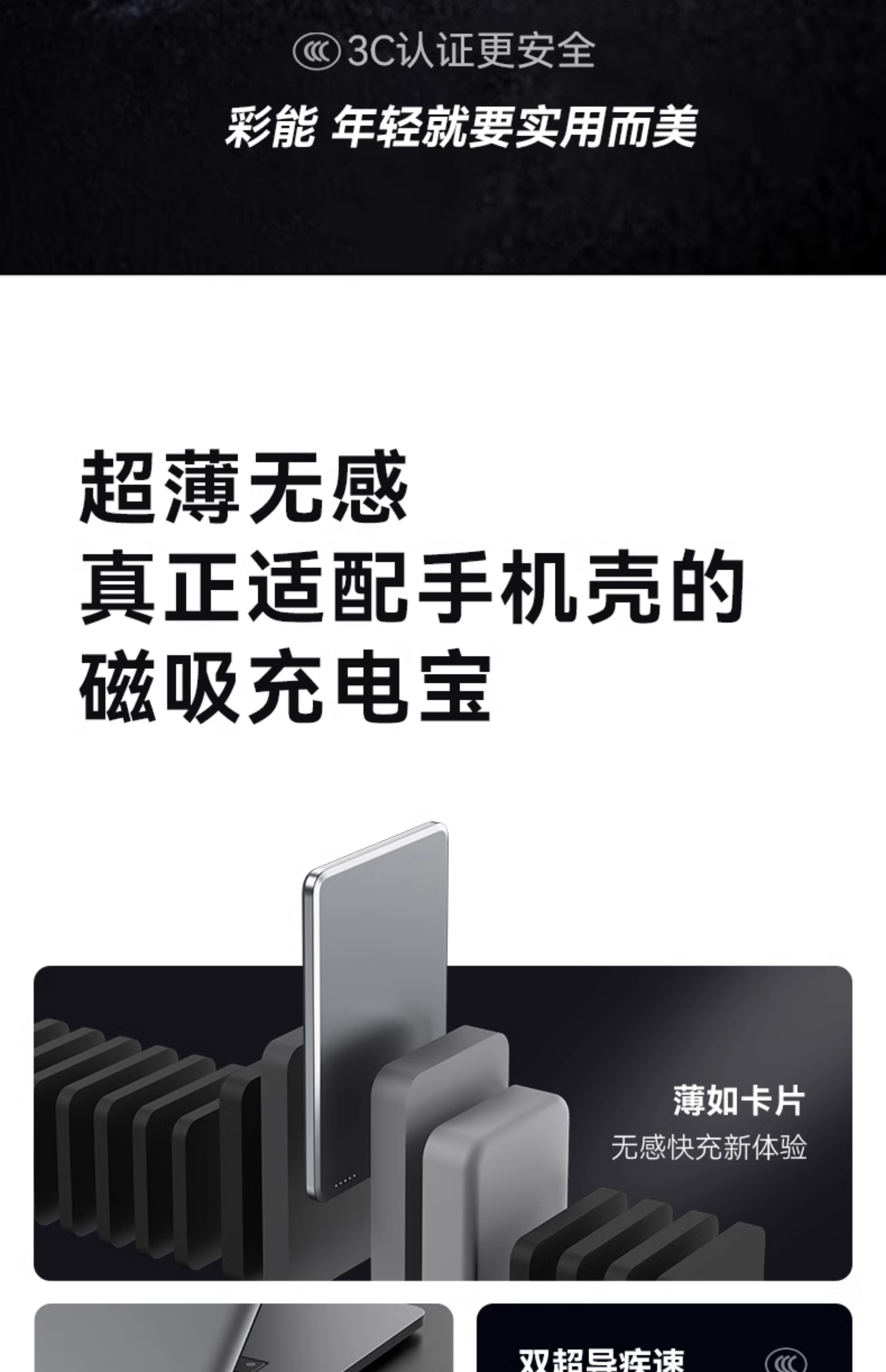【30000M|0.65cm全网最薄】彩能正品快充magsaf磁吸无线充电宝超薄轻薄小巧便携移动电源适用于苹果
