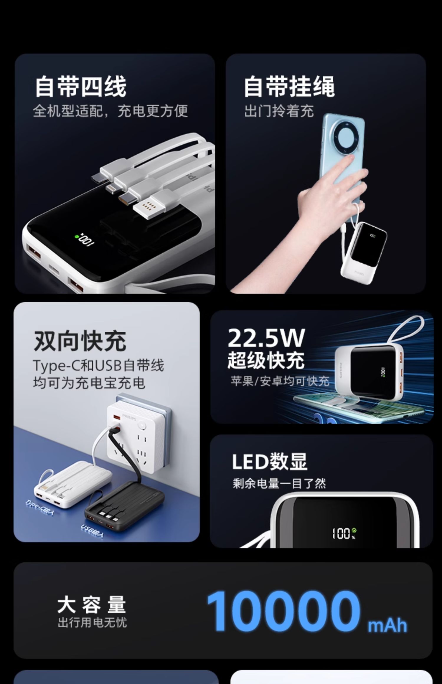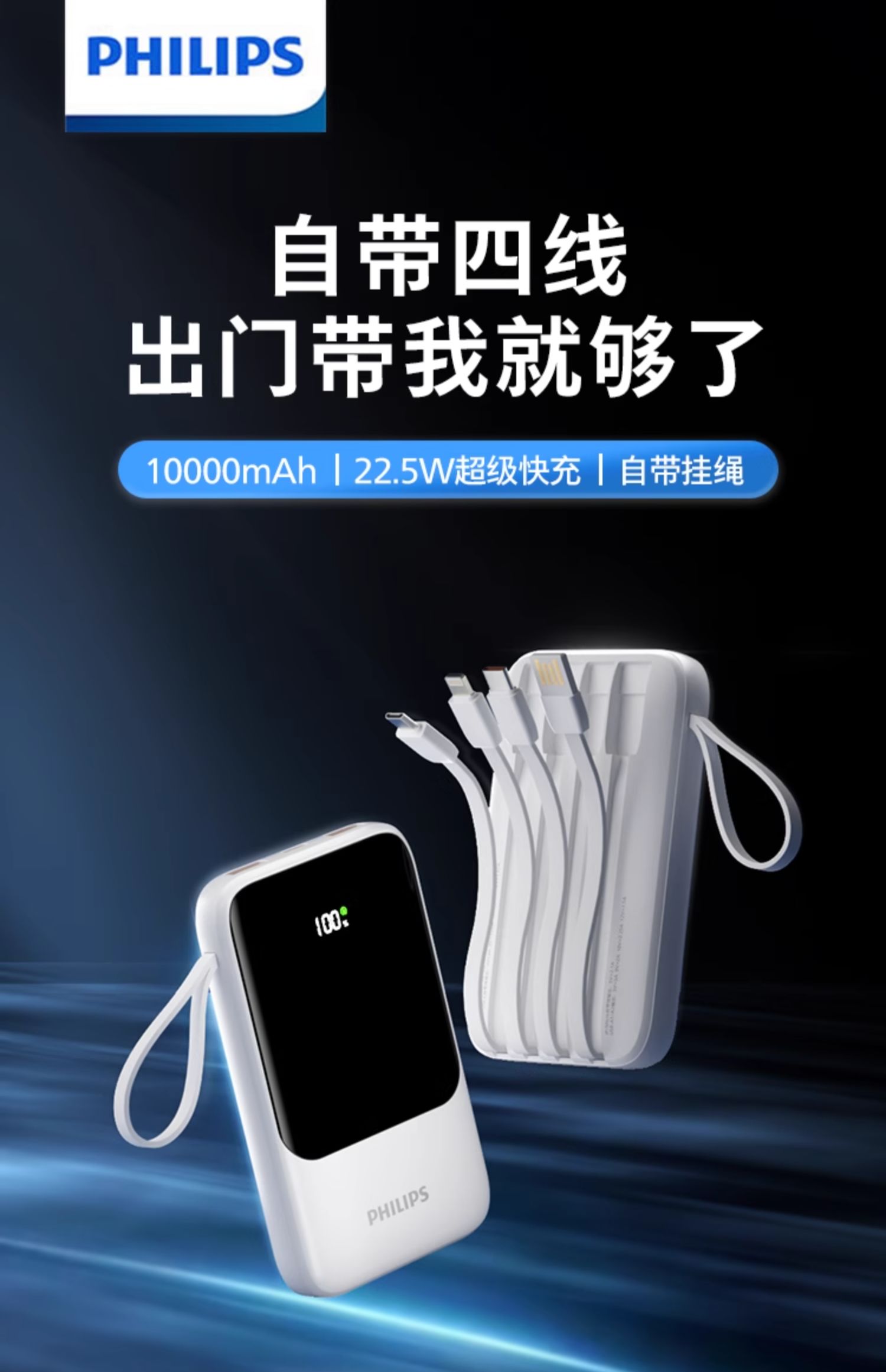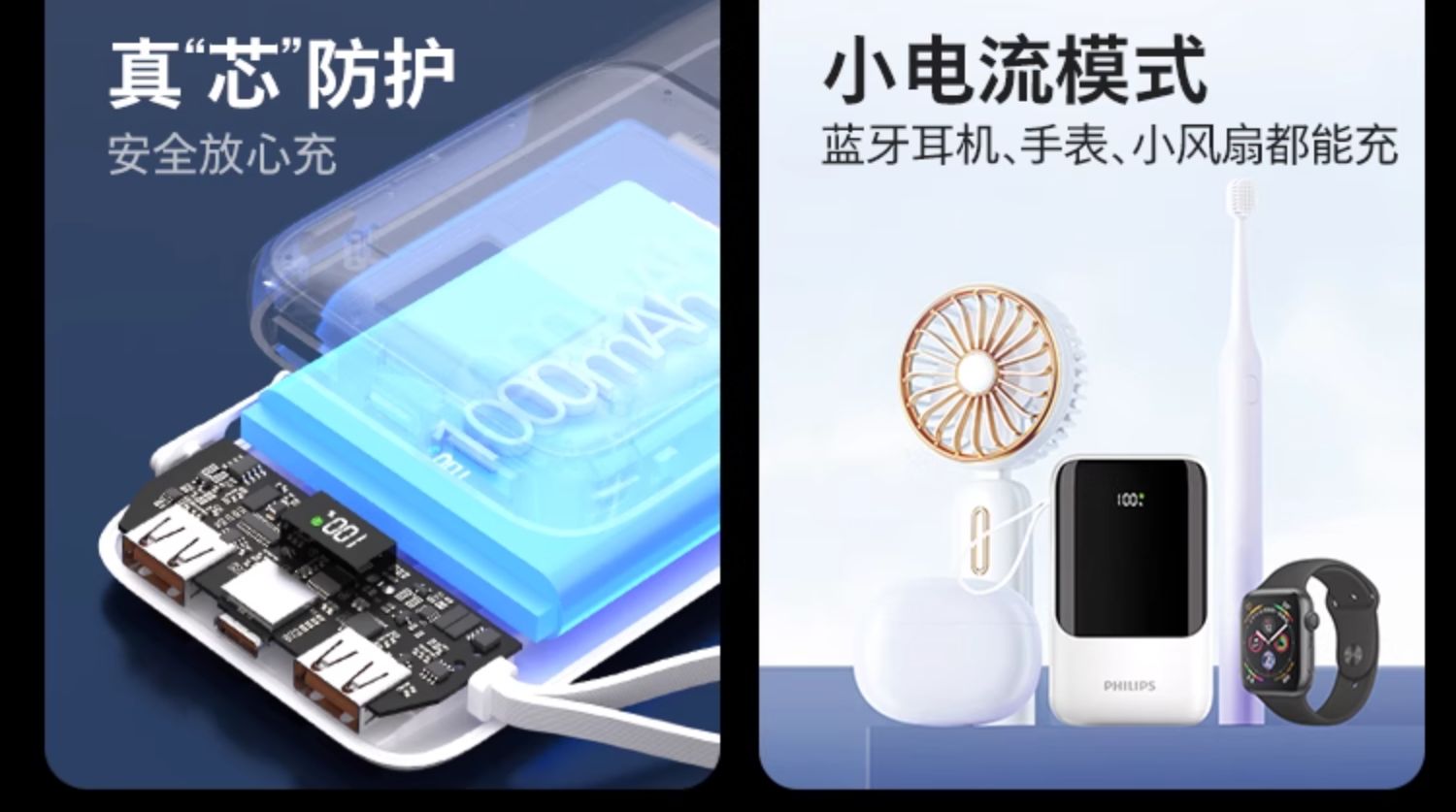 飞利浦充电宝20000毫安自带四线移动电源快充多口输出超薄小巧便携迷你便携2024新款适用苹果15华为小米2223