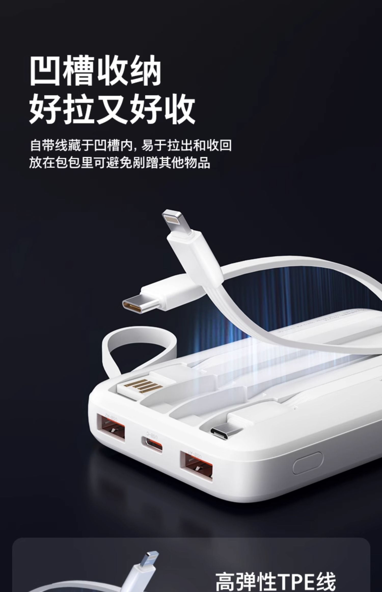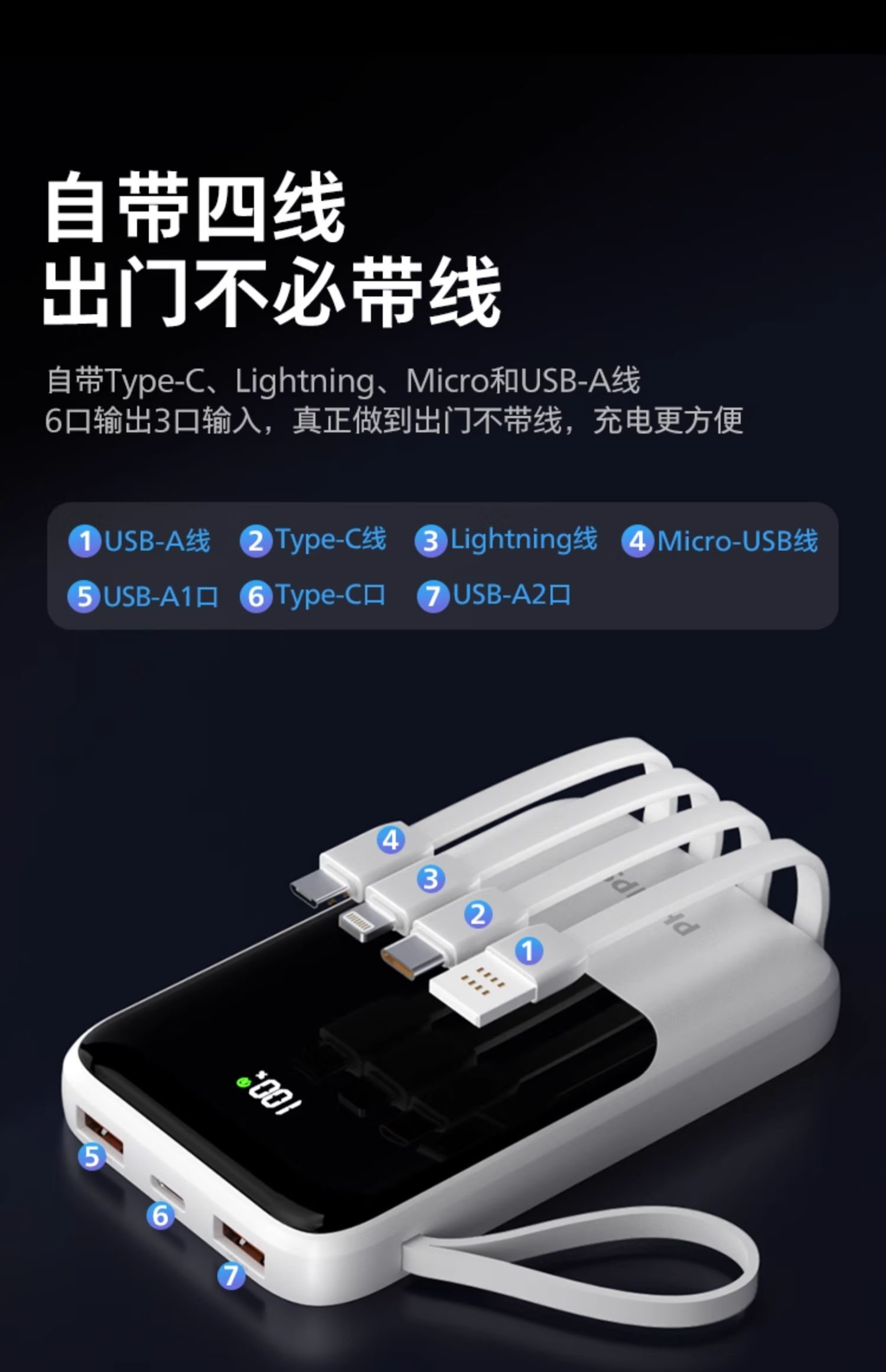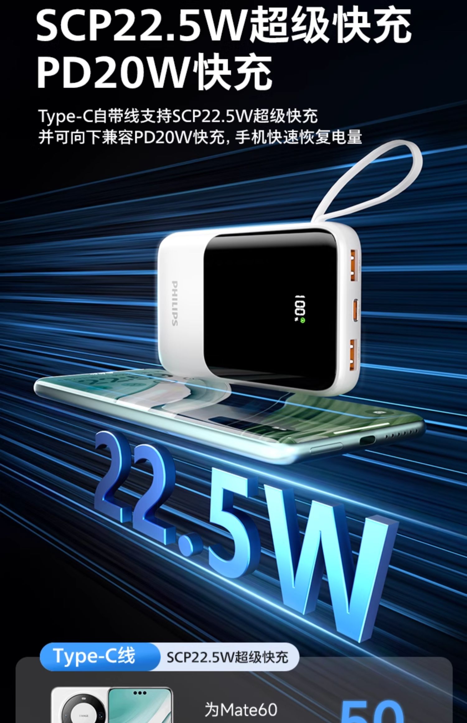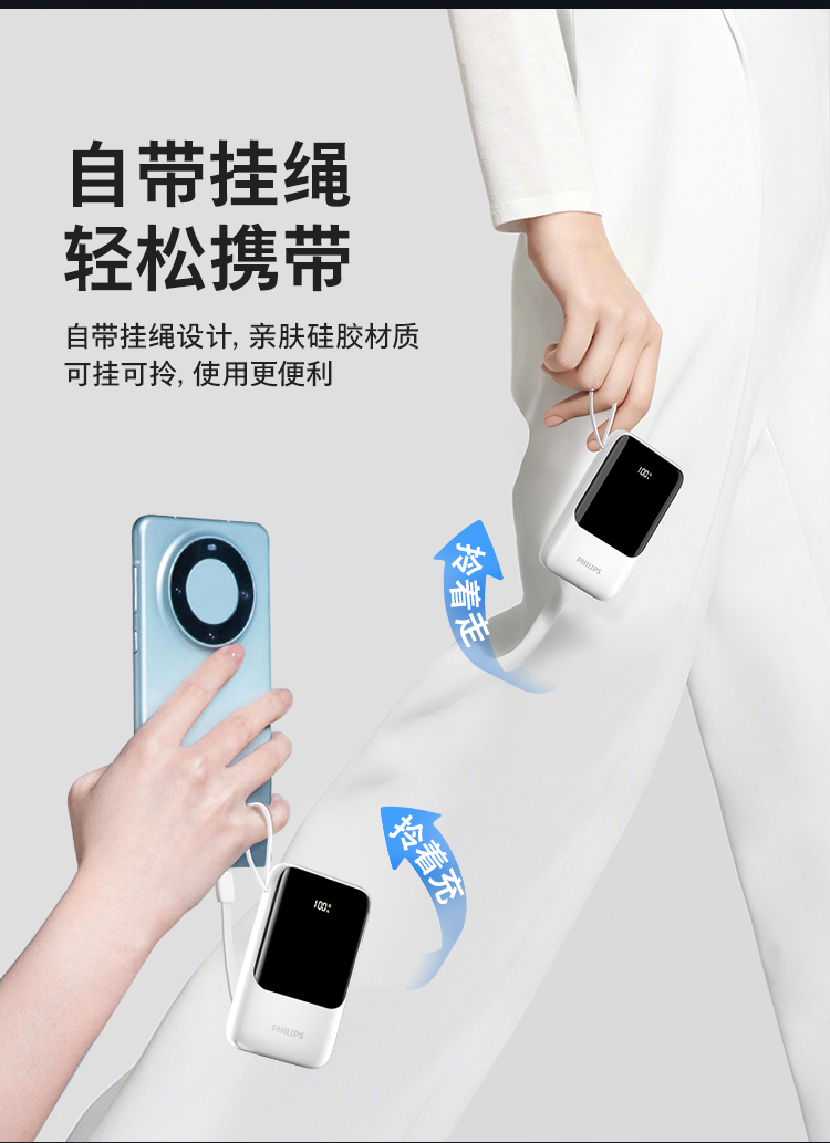 飞利浦充电宝20000毫安自带四线移动电源快充多口输出超薄小巧便携迷你便携2024新款适用苹果15华为小米2223
